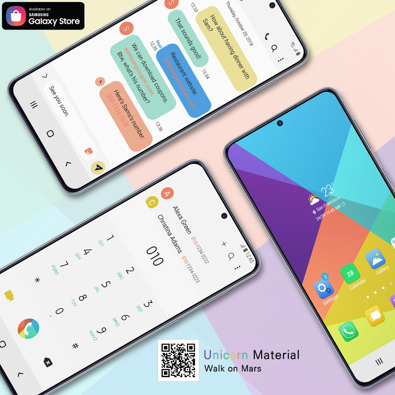 Walk on Mars의 Unicorn Material 테마는 갤럭시 테마 스토어를 통하여 다운로드하실 수 있습니다.