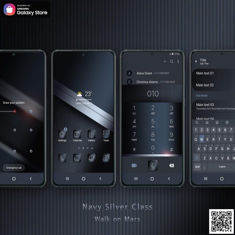 Walk on Mars의 Navy Silver Class 테마는 갤럭시 테마 스토어를 통하여 다운로드하실 수 있습니다.