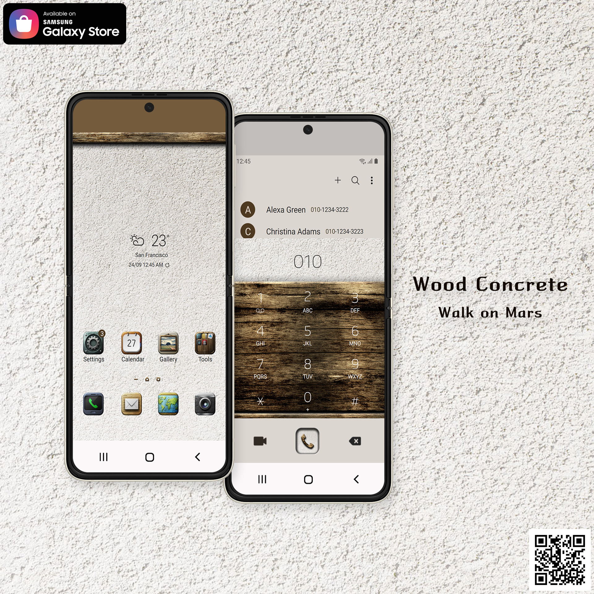Walk on Mars의 Wood Concrete 테마는 갤럭시 테마 스토어를 통하여 다운로드하실 수 있습니다.